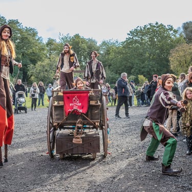Dans un royaume médiéval, un groupe de lutins joyeux et espiègles parcourt les routes, tirant derrière eux une grande charrette remplie d’objets mystérieux et de trésors.